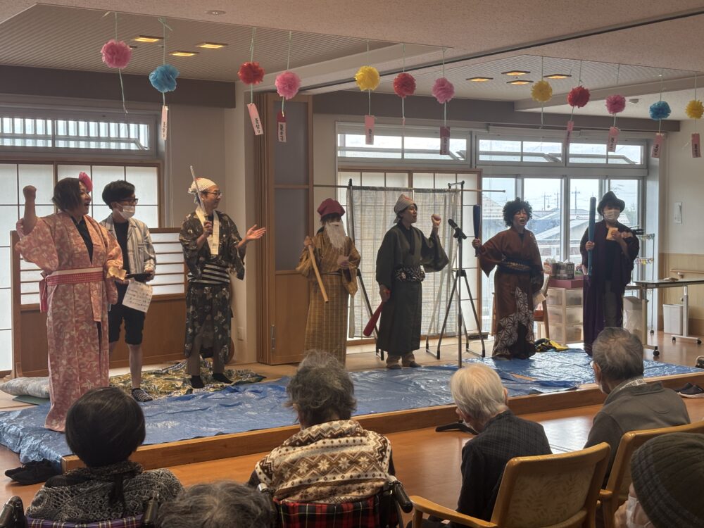 9月28日(日)に、少し遅めの敬老会を開催しました。 当日は、職員による寸劇や歌、踊りなどの出し物を披露し、入居者の皆さまに楽しんでいただきました。 おどけた演技には会場から大きな笑い声もあがり、和やかで賑やかなひとときとなりました。