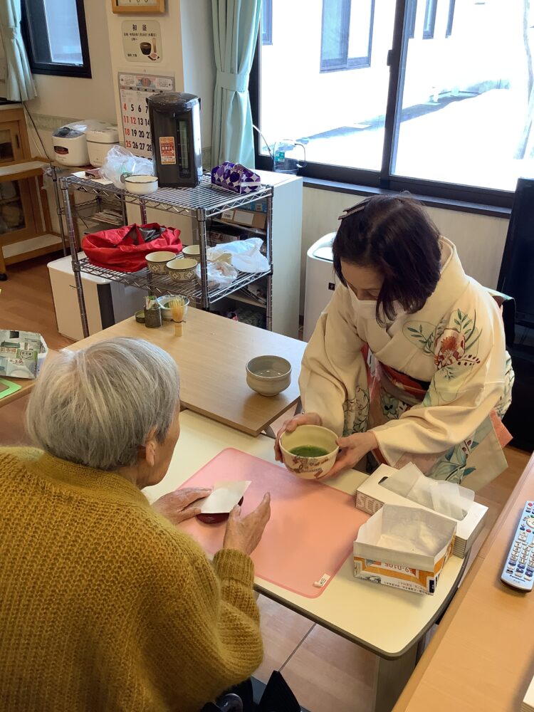 1月28日、サテライト芙蓉で「初釜」を行いました。 当日は管理栄養士が心を込めてお茶をたて、入居者の皆さまに季節の和菓子とともにお楽しみいただき、和やかな時間となりました。 日本の伝統文化に触れながら、季節を感じていただけるひとときとなりました。